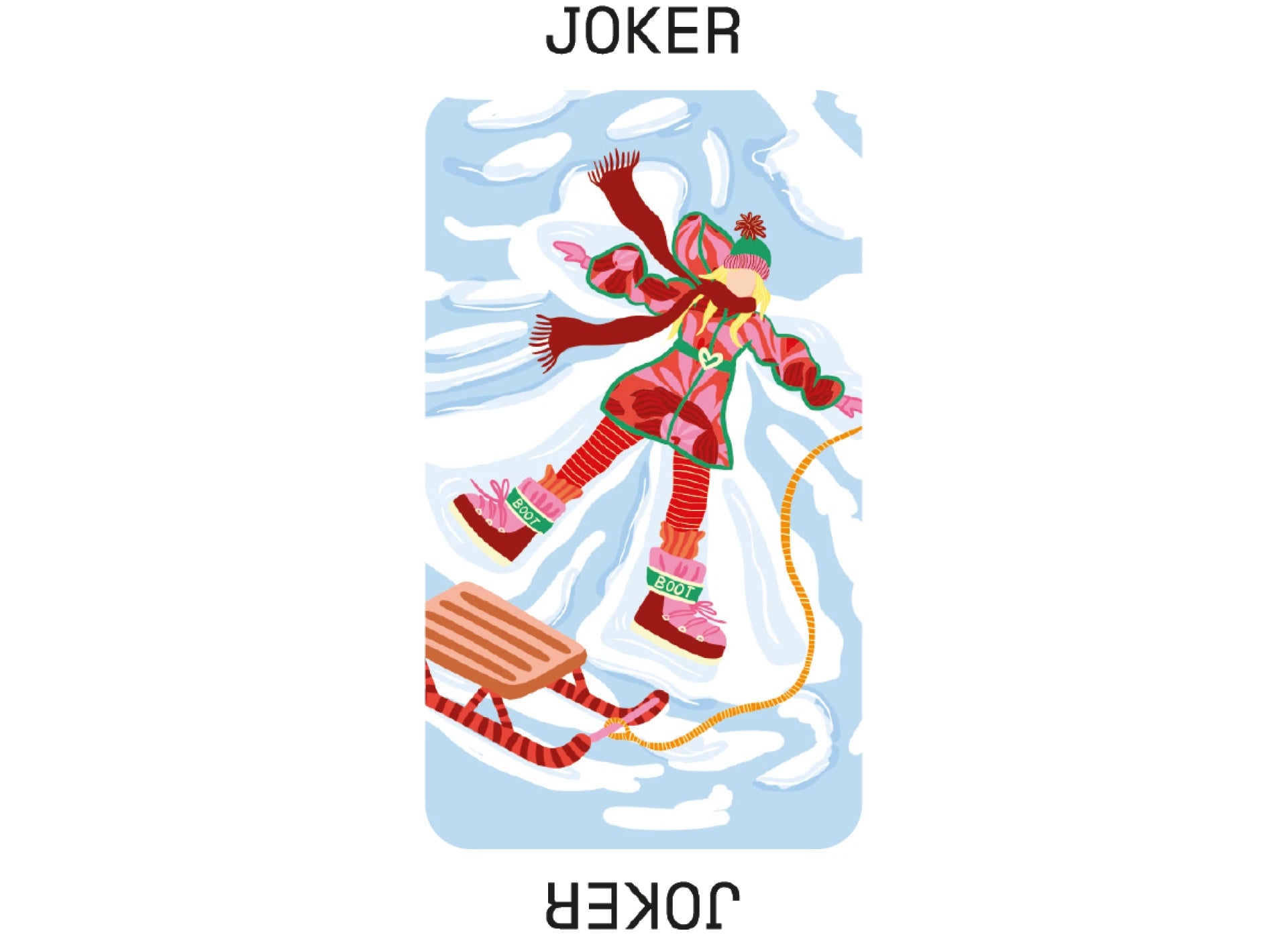 De kaarten zijn rijk geïllustreerd met vrolijke winterscènes — skiërs, snowboarders en sneeuwpret — een frisse, moderne knipoog naar het klassieke kaartspel.