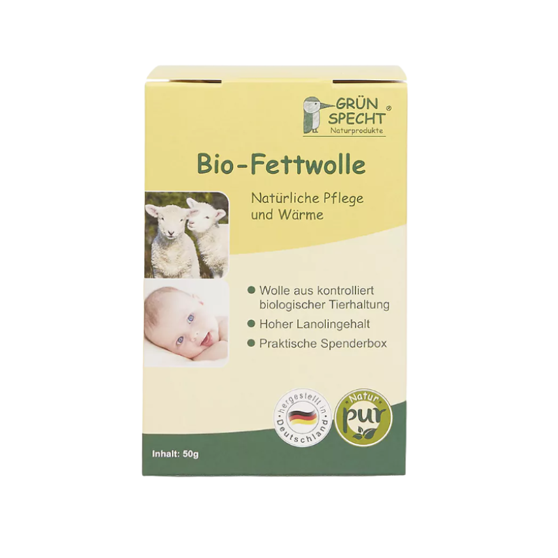 Vette wol, ook wel bekend als heil wol of "ruwe wol", is ideaal voor natuurlijke huidverzorging en warmte. Deze zachte schapenwol van Grünspecht verzacht gevoelige huidzones, zoals schrale tepels en de kwetsbare babyhuid bij de billetjes.
