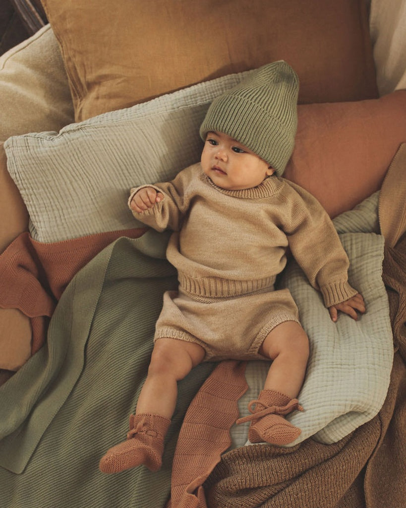 Ook mooi bij de Bibi-deken Ochre of de Joha wollen romper in Naturel.