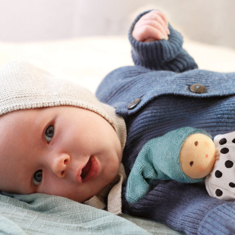 Zoals altijd is dit popje met de hand gemaakt in Duitsland, van 100% biologisch katoen en gevuld met zuivere scheerwol. Volledig gifvrij, ademend en zacht voor de kwetsbare babyhuid. Het popje is ongeveer 25 cm en weegt 50 gram.