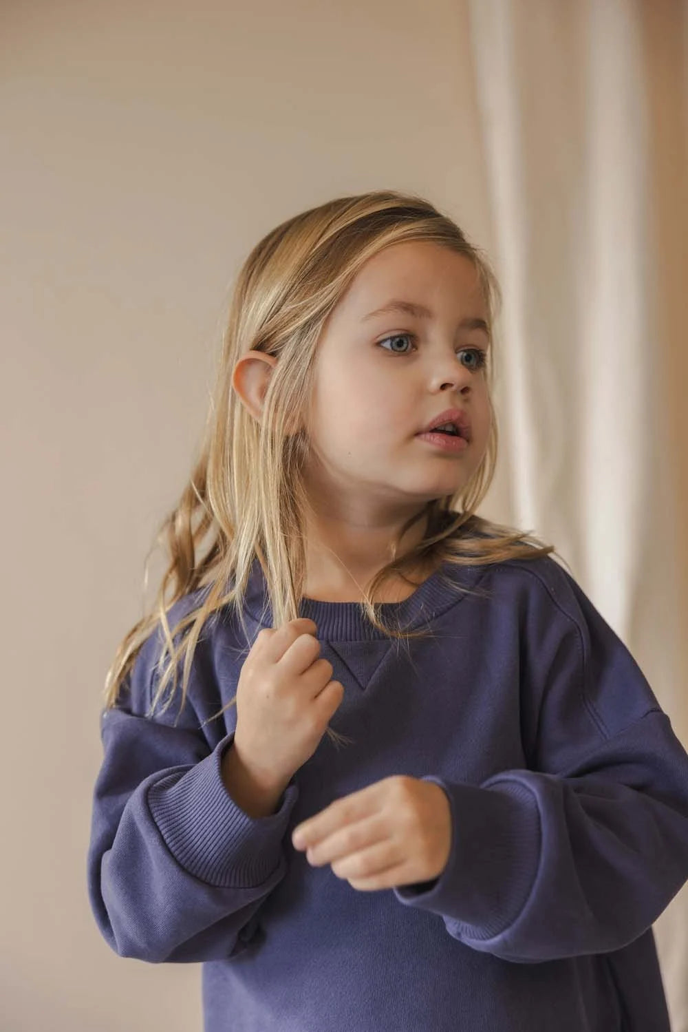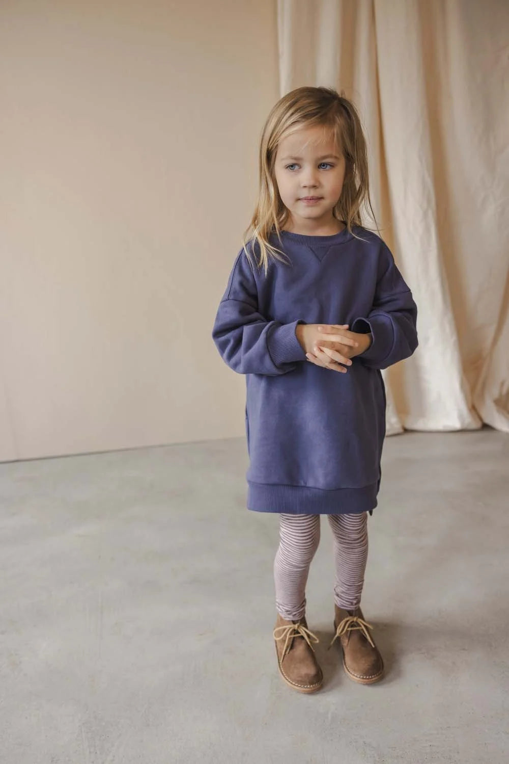 De Dusk Blue sweater dress combineert stoer en lief in รฉรฉn. Mijn dochters dragen dit jurkje non-stop โ het voelt als een sweater maar ziet eruit als een jurkje. De ingebouwde zakjes zijn favoriet: ideaal voor kleine verzamelaars die onderweg schatten rapen of gewoon hun handjes willen warmen.